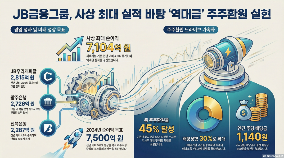 사상 최대 실적을 낸 JB금융그룹이 배당과 자사주 매입을 동시에 확대하며 주주환원 드라이브에 속도를 낸다. 배당성향을 30%까지 높여 배당소득 분리과세 혜택을 확보했고, 총 주주환원율은 45%까지 올라섰다.