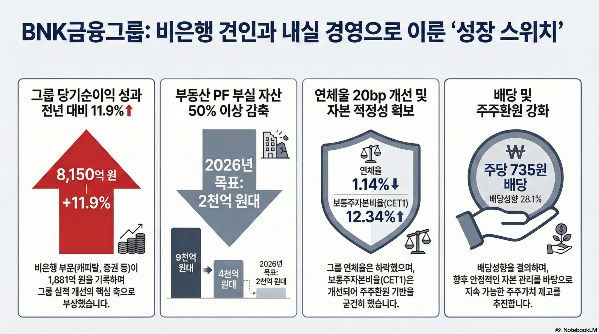 BNK금융그룹 순이익이 증권·자산운용을 중심으로 8000억원을 넘어섰다. 자산건전성과 자본적정성 지표도 함께 개선되며 배당 확대 여력도 커졌다.