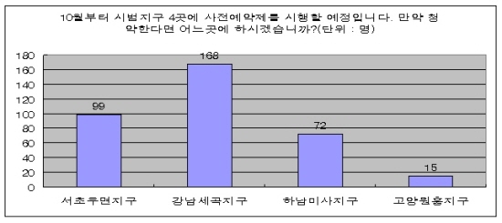 특히 '10월에 본격적으로 사전예약제가 시행된다. 만약 신청한다면 어느 곳에 하겠느냐'라는 질문에는 47%인 168명이 '강남 세곡지구'를 꼽았다. 이어 28%인 99명이 서초 우면지구, 20%인 72명이 '하남 미사지구', 4%인 15명이 '고양 원흥지구'를 답했다.
