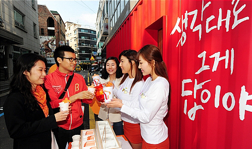 14일 오전 서울 강남구 신사동 가로수길에서 SK텔레콤의 '생각대로T(Tea) 이벤트'가 열려 T팝업 스토어-T룸을 찾은 고객들이 자신이 원하는 차를 골라 즐기고 있다.