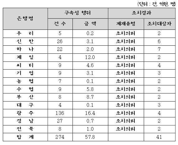 이번 확정된 검사 결과에 따르면 총 13개 은행에서 274건(57억8000만원)의 대규모 꺾기 사례를 적발하고, 금감원은 총 41명에 대해 해당 금융사에 조치 의뢰했다.
