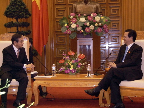 ▲김동수 수출입은행장(왼쪽)과 응웬 떤 중(Nguyen Tan Dung) 베트남 총리(오른쪽)가 베트남 하노이에서 만나 양국 경협관계의 발전적 협력방향에 대해 논의하고 있다.