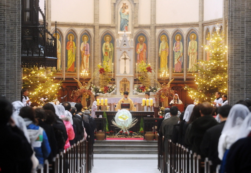 성탄절인 25일 오전 서울 명동성당을 찾은 천주교 신자들이 성탄미사를 보고 있다. <뉴시스>