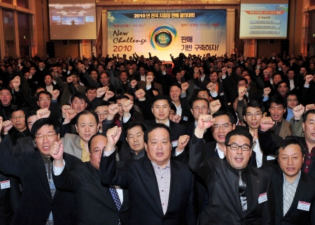▲기아차가 2010년 전국지점장 판매결의대회를 열었다.이 자리에서 올해 목표인 내수 점유율 35% 달성을 위한 결의를 다졌다