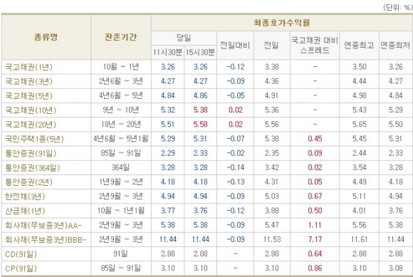 11일 금융투자협회가 고시한 최종호가수익률은 국고 3년은 9bp 하락한 4.27%, 국고 5년은 5bp 하락한 4.86%을 기록했다. 국고 1년물은 12bp 하락한 3.26%로 마감했다. 장기물인 10년물은 2bp 상승한 5.38%, 20년물은 2bp 상승한 5.58%로 각각 고시됐다.