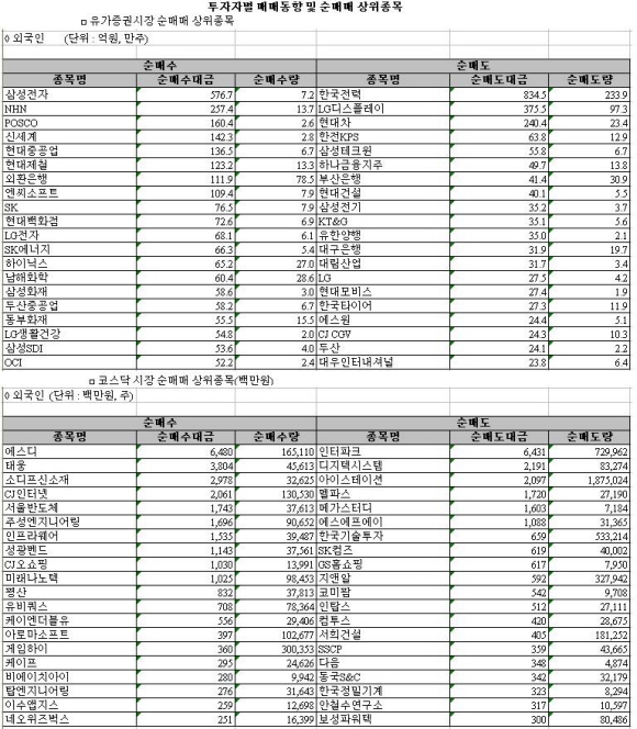 종목별로 삼성전자(576억원), NHN(257억원), POSCO(160억원), 신세계(142억원), 현대중공업(136억원) 등을 순매수했다.