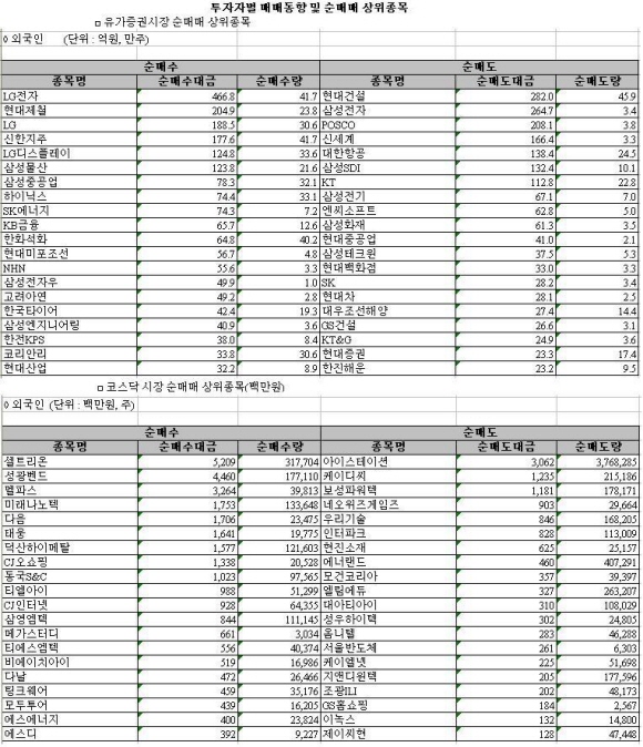 종목별로 LG전자(466억원), 현대제철(204억원), LG(188억원), 신한지주(177억원), LG디스플레이(124억원) 등을 순매수했다.