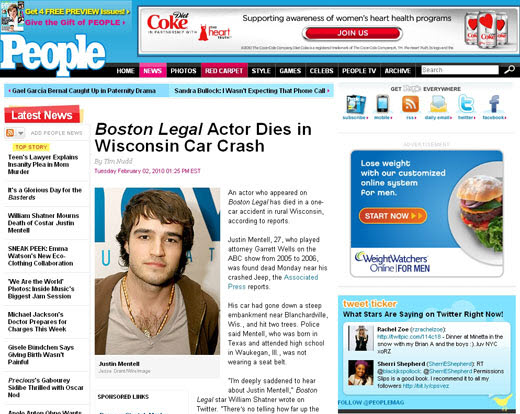 2일(현지시간) 외신들은 "드라마 보스톤 리걸의 스타 저스틴 멘텔이 위스콘신 블랜차드빌 인근에서 교통사고로 사망했다"고 보도했다.