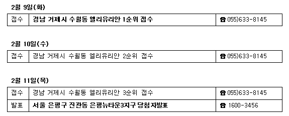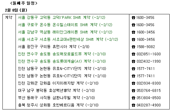 그 밖에는 서울 은평뉴타운 3지구의 당첨자 발표와 인천 송도지구 2개 단지의 계약이 진행될 예정이다. 은평뉴타운 3지구는 2월 11일 당첨자 발표를 시작한다. 은평뉴타운 3지구는 지난 2월 1일 1순위 청약 접수 결과 1891가구(특별공급제외) 모집에 5287명이 몰려 평균 2.79 대 1의 경쟁률을 기록했지만 대형 주택형 일부는 순위 내 미달하기도 했다.