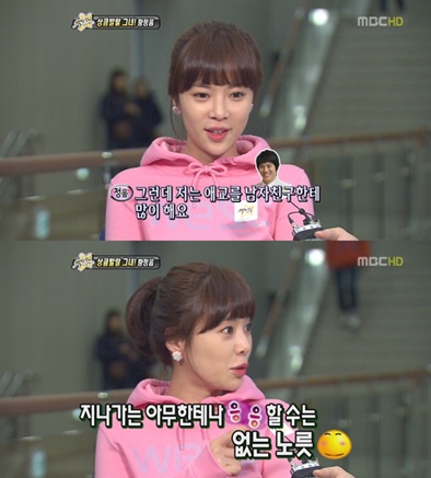 MBC 시트콤 '지붕뚫고 하이킥'에서 애교의 여왕으로 등극한 황정음은 극중 연하남인 세호의 짝사랑을 받고 있다. 이날 황정음은 연하남에 대해 "너무 좋다. 귀엽다"면서도 "실제로 대시해온다면 친구 이상은 힘들 것 같다. 연하에게 애교를 부릴 순 없을 것 같다"고 말했다.