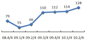 대한상공회의소는 최근 전국 1564개 제조업체를 대상으로 '2·4분기 기업경기전망'을 조사한 결과, 기업경기실사지수(BSI) 전망치가 128로 집계됐다고 25일 밝혔다. 이는 2002년 2분기(133) 이후 8년 만에 가장 높은 수치다.