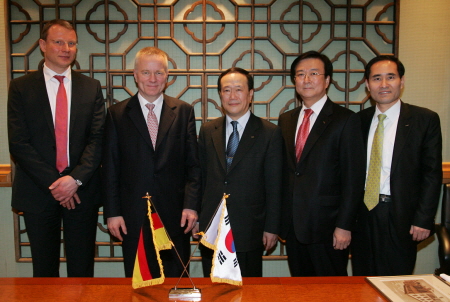 25일 김봉수 한국거래소 이사장(사진 가운데)이 서울 반포동 메리어트호텔에서 안드리아스 프로이스 Eurex CEO를 만나 KRX-Eurex간 코스피200 옵션 연계관련 현안 등을 논의한 후 기념촬영을 했다.