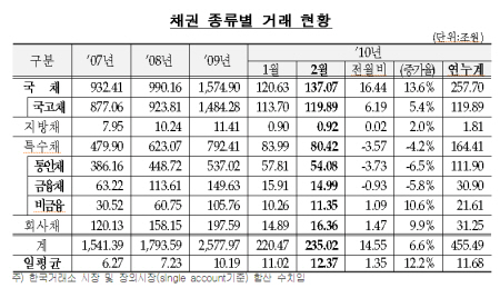 한국거래소에 따르면 지난 2월 월간 채권거래량이 235조200억원으로 전월과 비교해 14조5500억원이 늘어난 것으로 집계됐다.