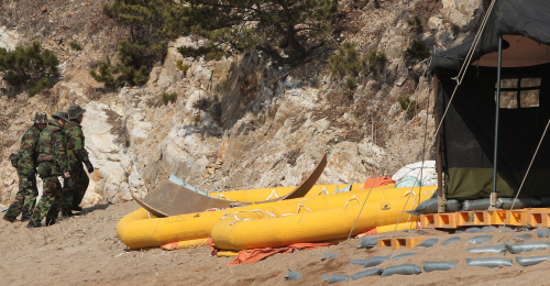 29일 천안함에서 나온 구명정과 선체구조물 파편이 백령도 장촌포구 지휘본부 천막 옆에 놓여 있다.