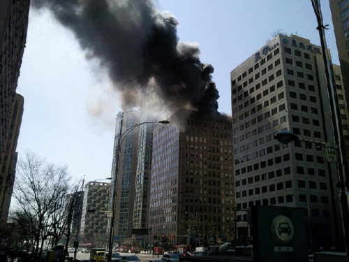 3일 오후 서울 마포구 한 빌딩 옥상 냉각탑에서 화재가 발생, 검은 연기가 피어오르고 있다.