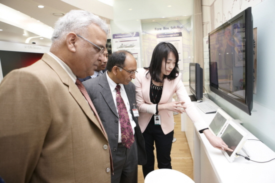 ▲네팔의 스실 기미르 정보통신부 행정장관, 네팔텔레콤 아마나스 씽 사장(왼쪽부터) 등이 상암IT센터를 방문, LG CNS 관계자의 e러닝시스템 시연하는 모습을 주의 깊게 지켜보고 있다.