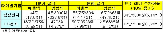 전기전자 업종을 담당하는 한 연구원은 "삼성전자의 경우 올해 반도체쪽의 이익이 워낙 좋을 것으로 예상돼 매출액과 영업이익이 모두 증가할 것으로 예상된다"며 "하지만 LG전자는 매출은 증가할 전망이나 영업이익은 지난해에 환율효과로 인해 비정상적으로 높게 나온 만큼 올해에는 감소할 것"이라고 말했다.
