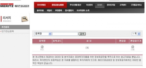 실제로 19일 현재 메리츠종금증권 홈페이지의 리서치 항목에서 추천종목, 단기관심종목, 증시캘린더는 사용하지 않는 홈페이지인 것과 같은 착각이 들 정도로 아무런 자료가 올라와 있지 않은 상태다.