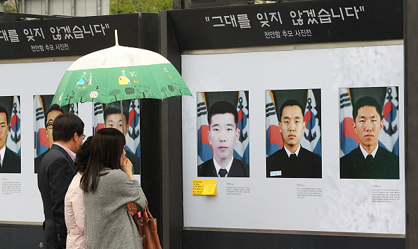 26일 오후 얇은 빗방울이 내리기 시작한 서울광장을 찾은 시민들이 천안함 추모 사진전을 보며 장병들을 애도하고 있다.