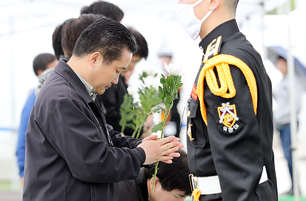 26일 오후 천안함 희생장병의 합동분향소가 차려진 서울광장을 찾은 한 시민이 헌화를 하기 전 기도를 올리고 있다.