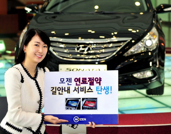 모젠 연료절약 길안내는 이번 달에 기아차 K7 프리미엄 내비게이션부터 적용된다. 5월에는 YF쏘나타와 싼타페 더 스타일, 베라크루즈 등으로 확대해 나갈 예정이다.
