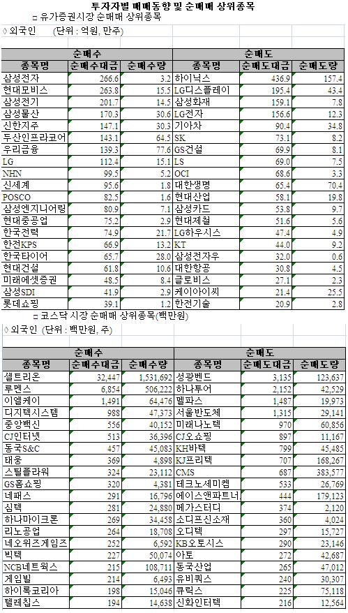 종목별로 삼성전자(266억원), 현대모비스(263억원), 삼성전기(201억원), 삼성물산(170억원), 신한지주(147억원)등이 순으로 순매수했다.