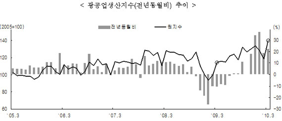 전년 동월 대비 광공업생산 증감율은 지난해 7월 0.7%, 8월 1.2%, 9월 11.0%, 10월 0.3%, 11월 18.1%, 12월 34.2%, 1월 37.0%, 2월 18.8%의 추이를 보였다.