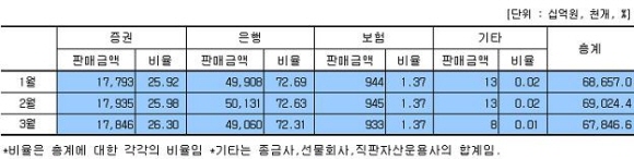 업권별로는 은행권의 적립식 판매 감소규모가 두드러져 전월대비 1조710억원 감소했다. 이는 전체 적립식 감소액인 1조1780억원의 91%를 차지하는 규모다.