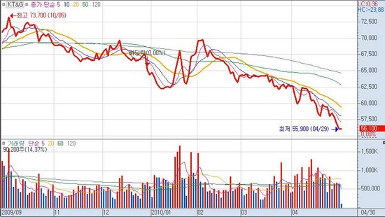 KT&G의 29일 종가는 연초와 비교할때 -12.89%(8300원) 떨어진 수준이며 지난해 10월5일 기록했던 52주 최고가인 7만3700원과 비교하면 무려 -23.88%(1만7600원)과 급락한 셈이다.