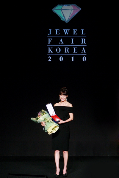 배우 한지혜씨가 '베스트 주얼리 레이디'로 선정된 후 상패를 받고 포즈를 취하고 있다.