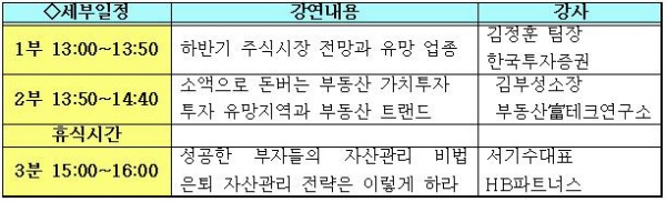 이날 강연회는 ▲글로벌경제 환경 변화의 이해▲하반기 주식 전망▲성공투자를 위한 부동산 가치투자 비법 ▲준비 안된 노후는 재앙이다▲행복한 노후준비를 위한 은퇴자산관리 전략에 대해 한국투자증권 김정훈팀장, 부동산富테크연구소 김부성소장, HR파트너스 서기수 대표의 강연으로 진행된다.
