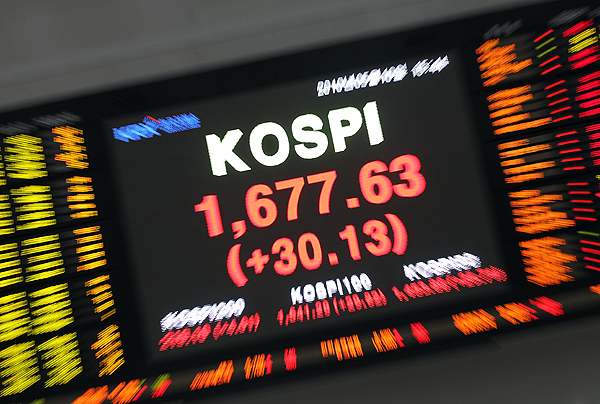 10일 오후 유럽발 재정위기로 인한 급락세를 딛고 5일만에 반등에 나선 코스피지수가 지난주말 종가에 비해 30.13포인트(1.83%) 오른 1677.63에 장을 마쳤다.