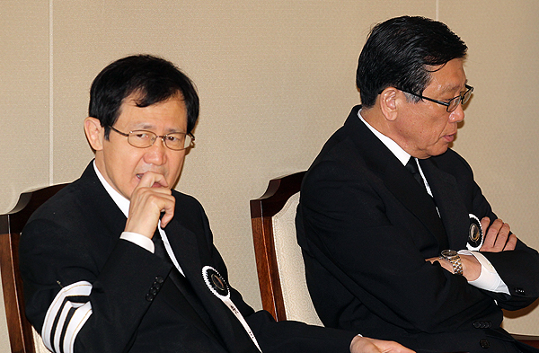 금호아시아나그룹 故 박인천 회장의 부인인 이순정 여사의 장례식 이틀째인 13일 오전 신촌세브란스 장례식장에서 박삼구 금호아시아나그룹 명예회장과 박찬구 금호석유화학회장이 조문객을 기다리고 있다.