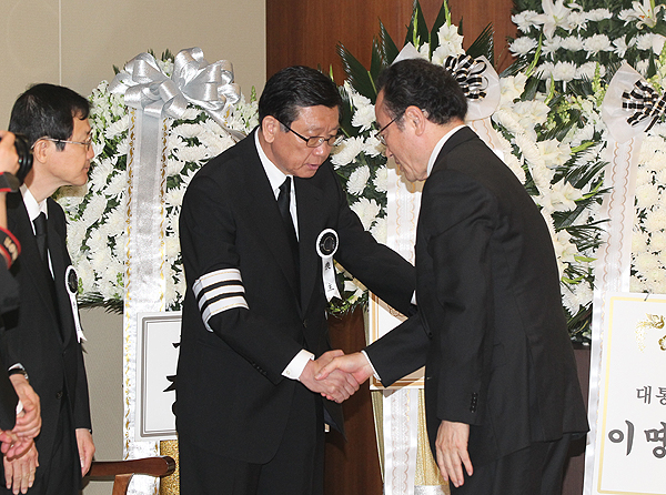 13일 한국무역협회 사공일 회장이 금호아시아나그룹 故 박인천 회장의 부인 故 이순정 여사의 빈소가 있는 신촌 세브란스 장례식장에서 조문을 마치고 박삼구 명예회장을 위로하며 악수를 나누고 있다.