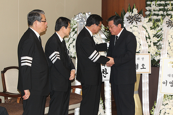 13일 GS칼텍스 허동수 회장이 금호아시아나그룹 故 박인천 회장의 부인 故 이순정 여사의 빈소가 있는 신촌 세브란스 장례식장에서 헌화 후 박삼구 명예회장을 위로하며 악수를 나누고 있다.