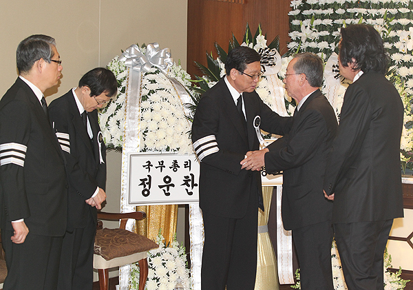 13일 이헌재 전 경제부총리와 이창동 감독이 금호아시아나그룹 故 박인천 회장의 부인 故 이순정 여사의 빈소가 있는 신촌 세브란스 장례식장에서 헌화 후 박삼구 명예회장을 위로하며 악수를 나누고 있다.