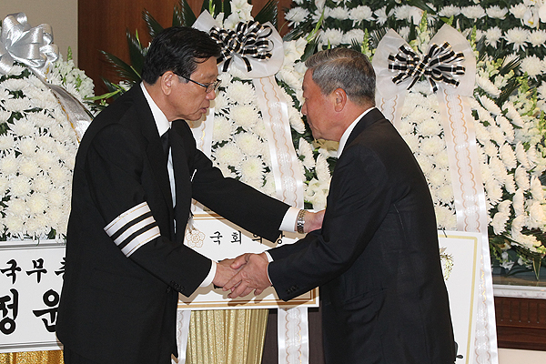 13일 LG그룹 구본무 회장이 금호아시아나그룹 故 박인천 회장의 부인 故 이순정 여사의 빈소가 있는 신촌 세브란스 장례식장에서 헌화 후 박삼구 명예회장을 위로하며 악수를 나누고 있다.