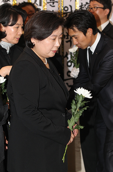 13일 금호아시아나그룹 故 박인천 회장의 부인 故 이순정 여사의 빈소가 있는 신촌 세브란스 병원 장례식장을 찾은 현대그룹 현정은 회장이 헌화하기위해 기다리고 있다.
