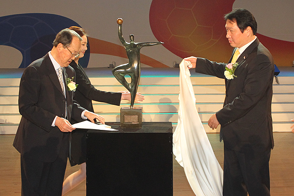 'SK 핸드볼경기장 건립공사 기공식 및 VISION 2020 선포식'이 17일 올림픽공원 내 펜싱경기장에서 열린 가운데 김종하 대한핸드볼협회 명예회장과 SK그룹 최태원 회장이 기념 조형물을 제막하고 있다.
