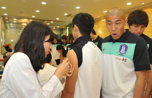 연세대 강남세브란스병원 내분비당뇨병센터팀이 지난 17일 파주 국가대표축구팀 트레이닝센터(NFC)를 찾아 대표선수단에게 신종인플루엔자A(H1N1) 항체 생성에 관련한 예방접종을 실시했다. 이날 이영표의 접종이 시작되자 다음 차례인 차두리가 놀란 표정을 짓고 있다.