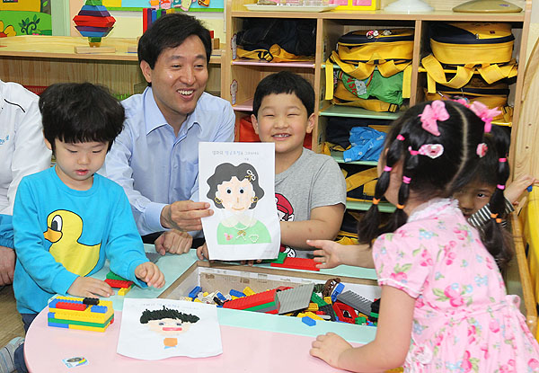 한나라당 오세훈 서울시장 후보가 24일 오전 서울 남가좌동 세연어린이집을 방문해 어린이들과 대화하고 있다.