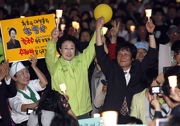 27일 저녁 서울 광화문 광장에서 열린 '생명과 평화를 위한 한명숙의 서울마당'에서 민주당 한명숙 서울시장 후보가 지지를 호소하고 있다.