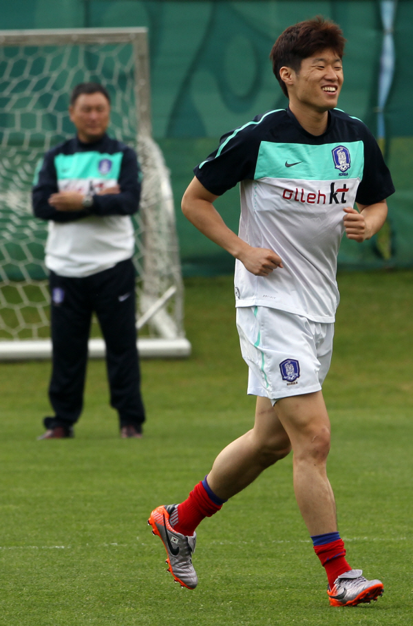 ▲27일 새벽(한국시간) 오스트리아 노이슈티프트 캄플훈련구장에서 훈련 중인 박지성이 미소 짓고 있다.(사진=연합뉴스)