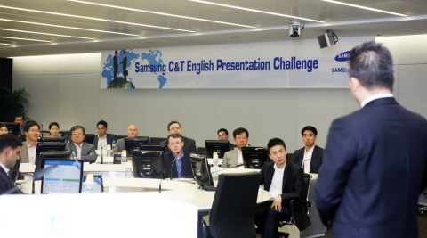 ▲삼성물산은 28일 글로벌 업무능력을 강화하기 위해 '영어프리젠테이션 대회'를 개최했다. 해외영업사업부, 해외건축사업부, 개발사업본부 등 총 6개팀이 참가한 이번 대회에서는 글로벌 마케팅 향상을 위한 다양한 제안과 전략 등을 영어로 프리젠테이션 하면서 심도있게 다뤘다고 회사측은 설명했다.