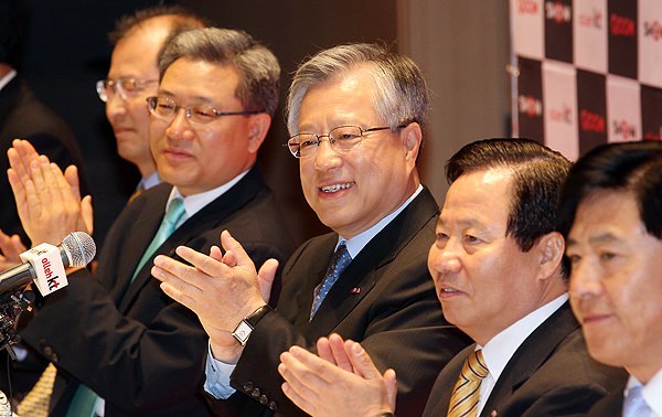 31일 오전 서울 광화문 KT사옥에서 열린 'KT-KTF 통합1주년' 기자간담회에서 이석채 회장및 사장단이 축하의 박수를 치고 있다.