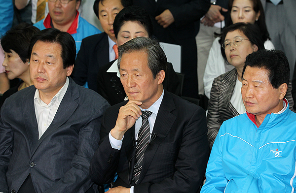 5회 동시지방선거 투표를 마친 2일 오후 여의도 한나라당사에 모인 정몽준대표 등 당직자들이 출구조사를 심각한 표정으로 바라보고 있다.
