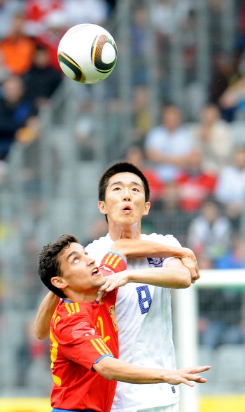 ▲4일(이하 한국시간)오전 오스트리아 인스브루크 티볼리노이 경기장에서 열린 대한민국과 스페인의 평가전에서 김정우가 공을 향해 돌진하고 있다.(사진=뉴시스)