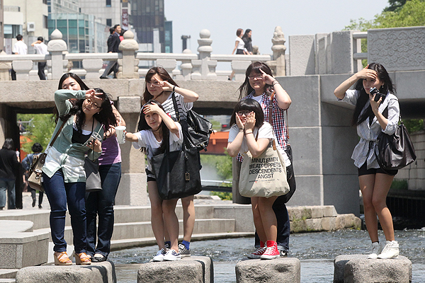 한여름 같은 날씨를 보인 4일 청계천을 찾은 여대생들이 친구들과 즐거운 오후를 보내고 있다.