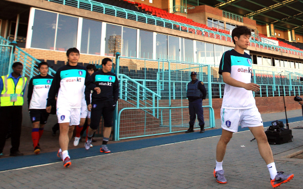 ▲5일 오후(한국시간) 남아프리카공화국 대표팀 캠프인 루스텐버그에 도착한 태극전사들이 훈련장인 올림피아파크구장에 입장하고 있다. (사진=연합뉴스)