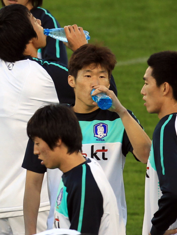 ▲5일 오후(한국시간) 태극전사들이 훈련장인 올림피아파크구장에서 첫 훈련을 시작한 가운데 박지성등 선수들이 훈련 도중 물을 마시고 있다.(사진=연합뉴스)